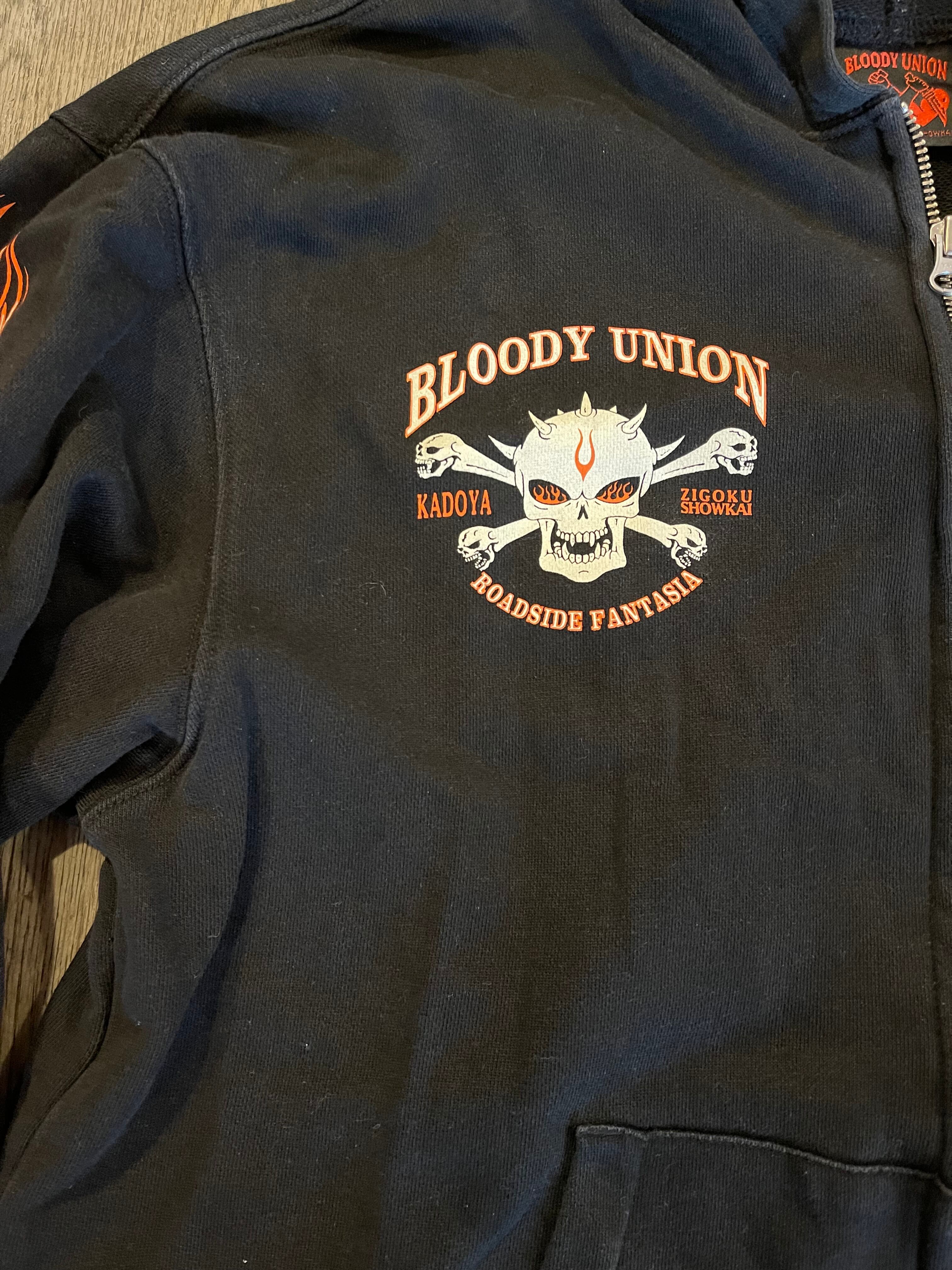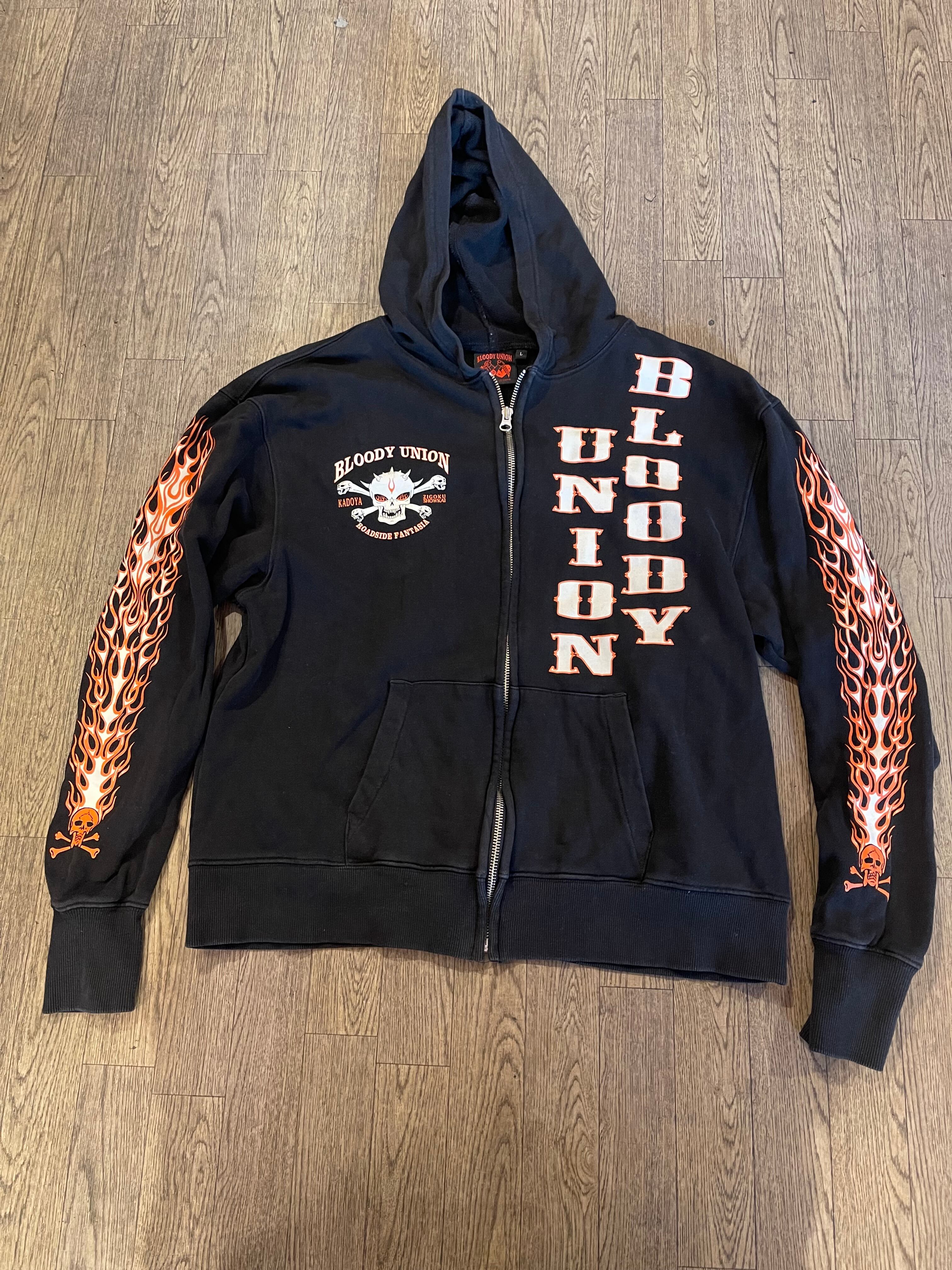 USED古着☆BLOODYUNIONdyKADOYAパーカーSIZE L ブラック&ファイヤパターン